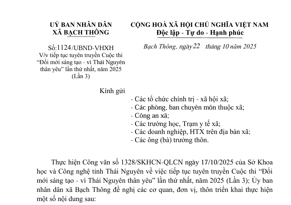 Thực hiện Kế hoạch số 111-KH/BTGDVTW, ngày 06/8/2025 của Ban Tuyên giáo và Dân vận Trung ương, Công văn số 233-CV/BTGDVTU Ngày 13 tháng 8 năm 2025, Ban Tuyên giáo và Dân vận tỉnh ủy Thái Nguyên về việc tổ chức Cuộc thi thi trực tuyến tìm hiểu về các nghị quyết của Đảng đối với cán bộ, đảng viên trên Internet, lần thứ nhất, Ban Xây dựng Đảng Đảng ủy xã Bạch Thông đã có văn bản đề nghị các đơn vị nghiêm túc, triển khai tuyên truyền sâu rộng về Cuộc thi và vận động, khuyến khích cán bộ, đảng viên, đoàn viên, hội viên, chiến sĩ lực lượng vũ trang tích cực hưởng ứng, tham gia Cuộc thi.
