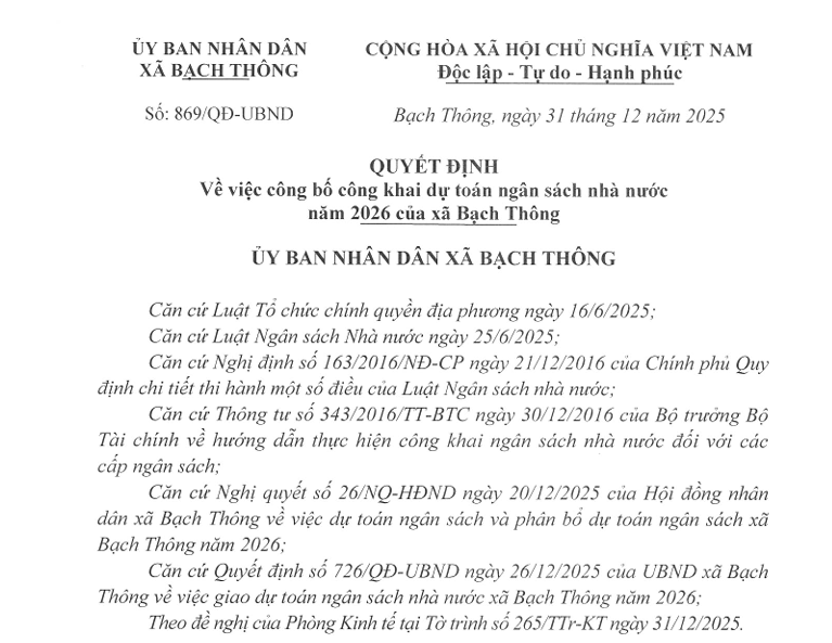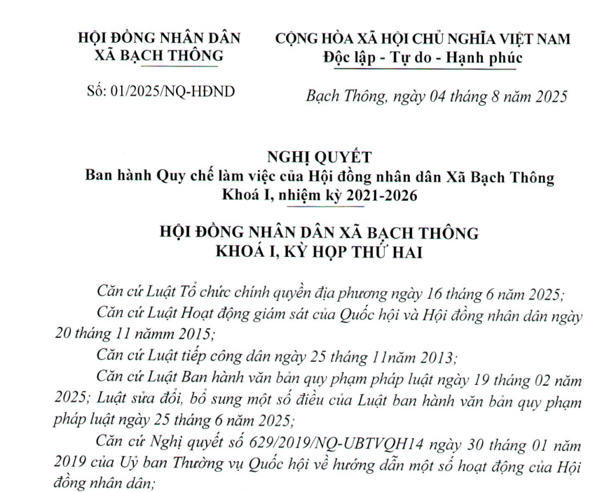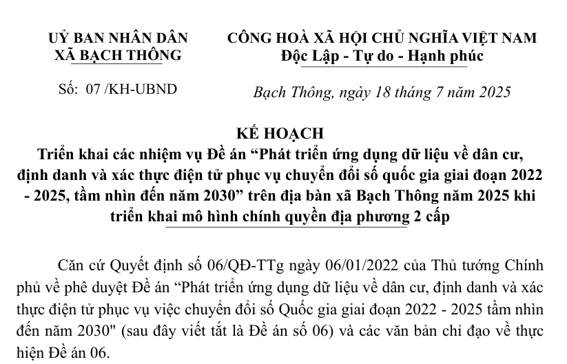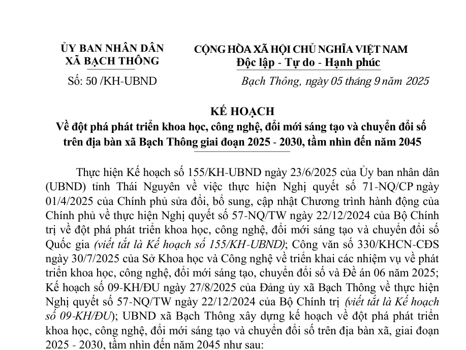 Ngày 11/9/2025, Chủ tịch UBND xã Bạch Thông đã ban hành Kế hoạch triển khai mô hình “Chính quyền thân thiện, Nhân dân phát huy quyền làm chủ” tại Ủy ban nhân dân xã Bạch Thông.