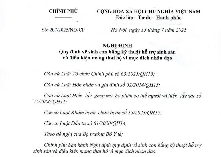 Thông tư số 38/2025/TT-BYT của Bộ Y tế quy định chi tiết về sinh con bằng kỹ thuật hỗ trợ sinh sản và mang thai hộ vì mục đích nhân đạo, có hiệu lực từ ngày 01/10/2025. Thông tư này hướng dẫn thực hiện Nghị định 207/2025/NĐ-CP của Chính phủ.